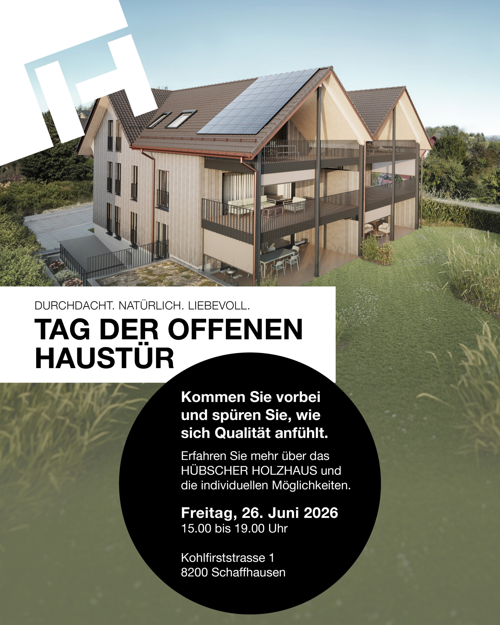 Am Freitag, 26. Juni 2026, laden wir Sie herzlich zu unserem Tag der offenen Haustür in Schaffhausen ein. Nutzen Sie die Gelegenheit, ein HÜBSCHER Holzhaus live zu erleben und sich persönlich von Qualität, Wohnkomfort und nachhaltiger Bauweise zu überzeugen.