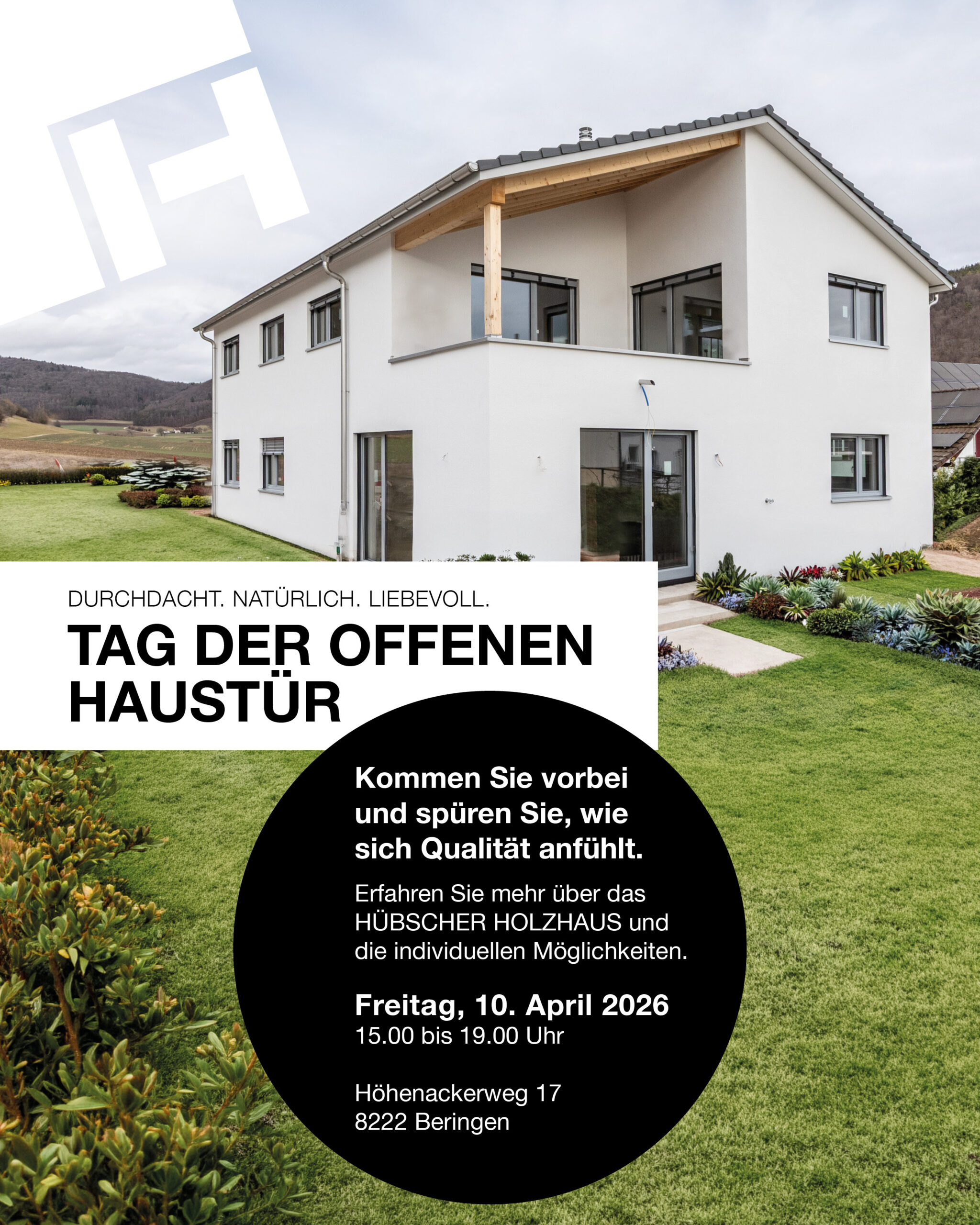 Am Freitag, 10. April 2026, laden wir Sie herzlich zu unserem Tag der offenen Haustür in Beringen ein. Nutzen Sie die Gelegenheit, ein HÜBSCHER Holzhaus live zu erleben und sich persönlich von Qualität, Wohnkomfort und nachhaltiger Bauweise zu überzeugen.