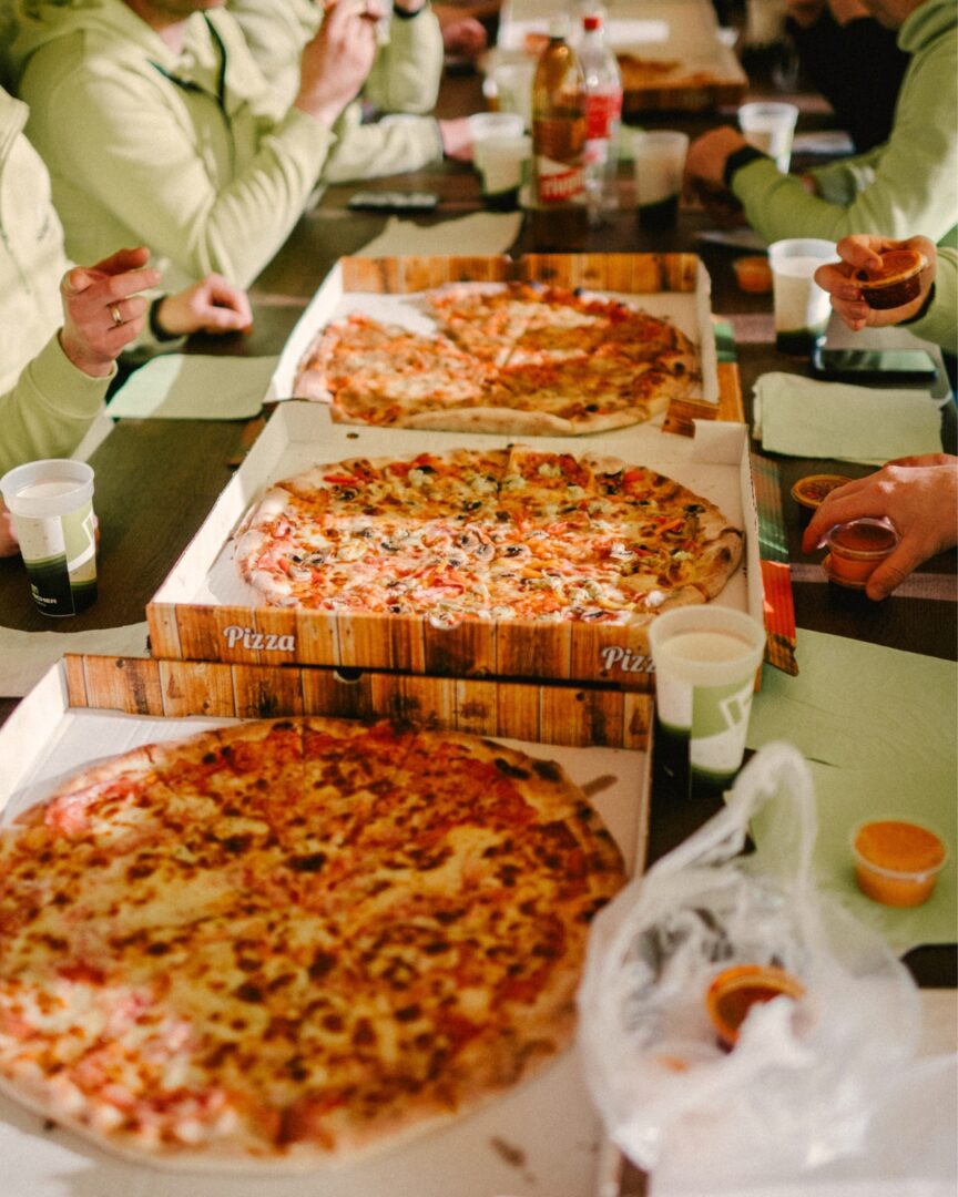 - Gemeinsames Mittagessen mit Pizza im Holzforum