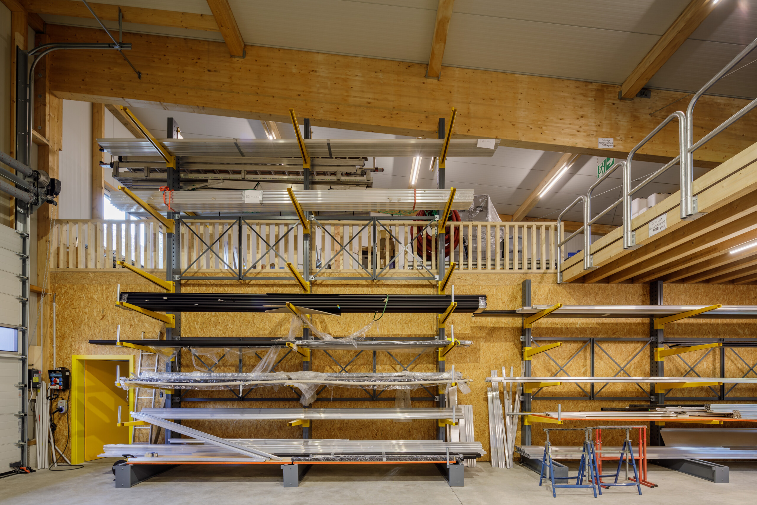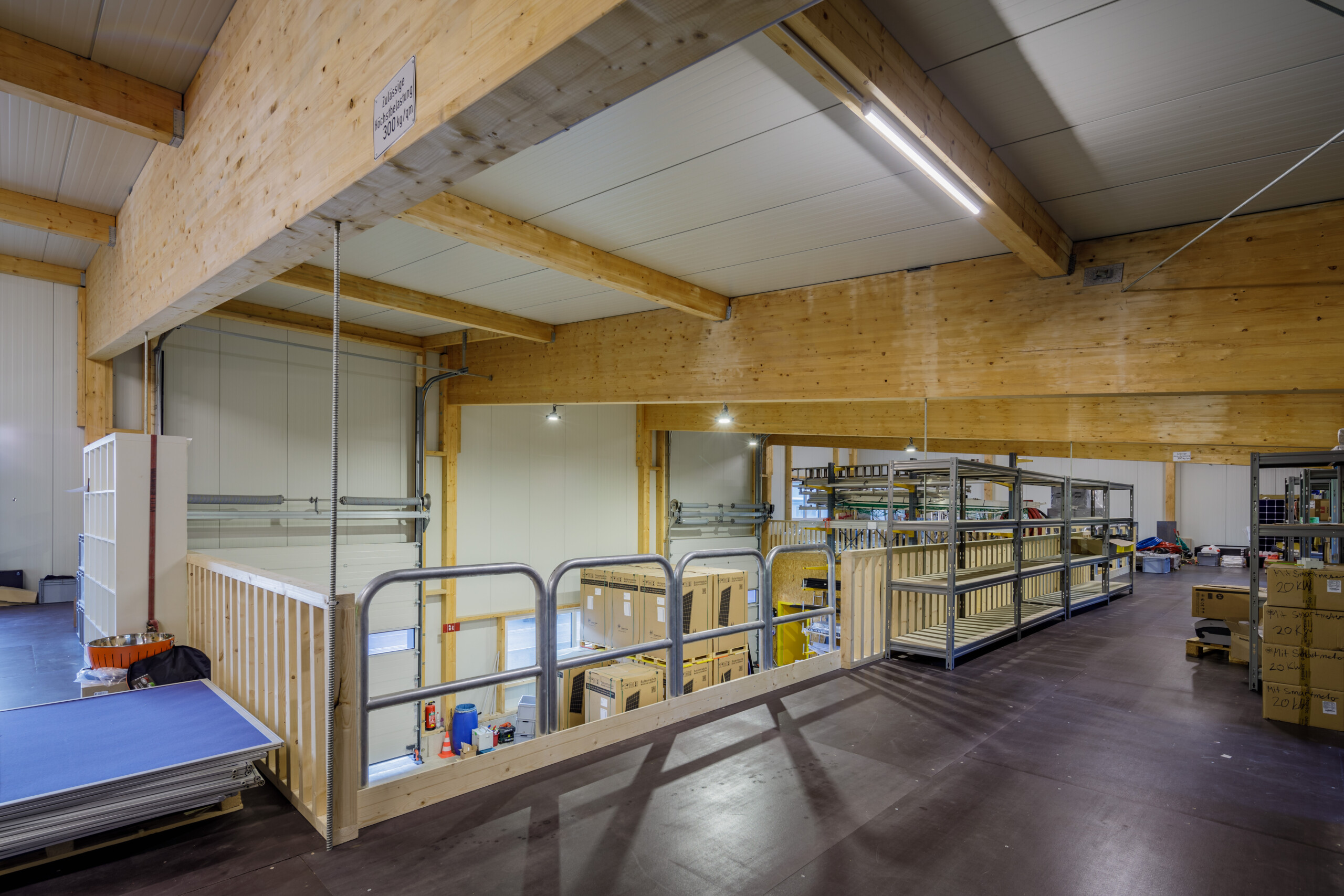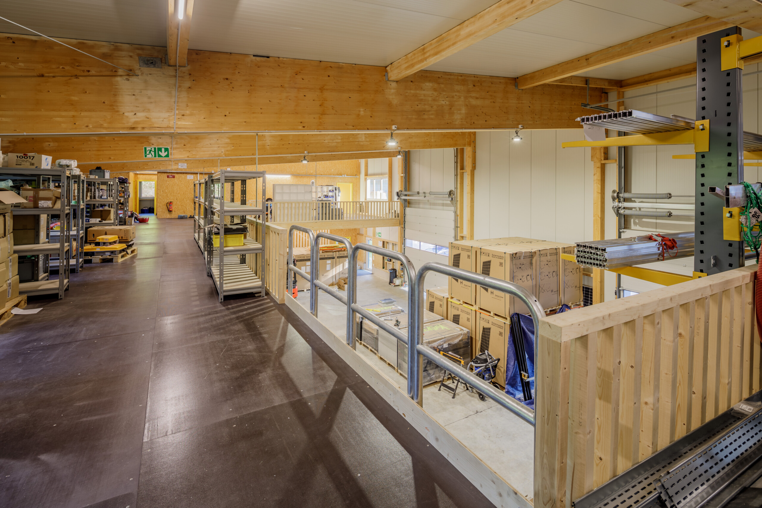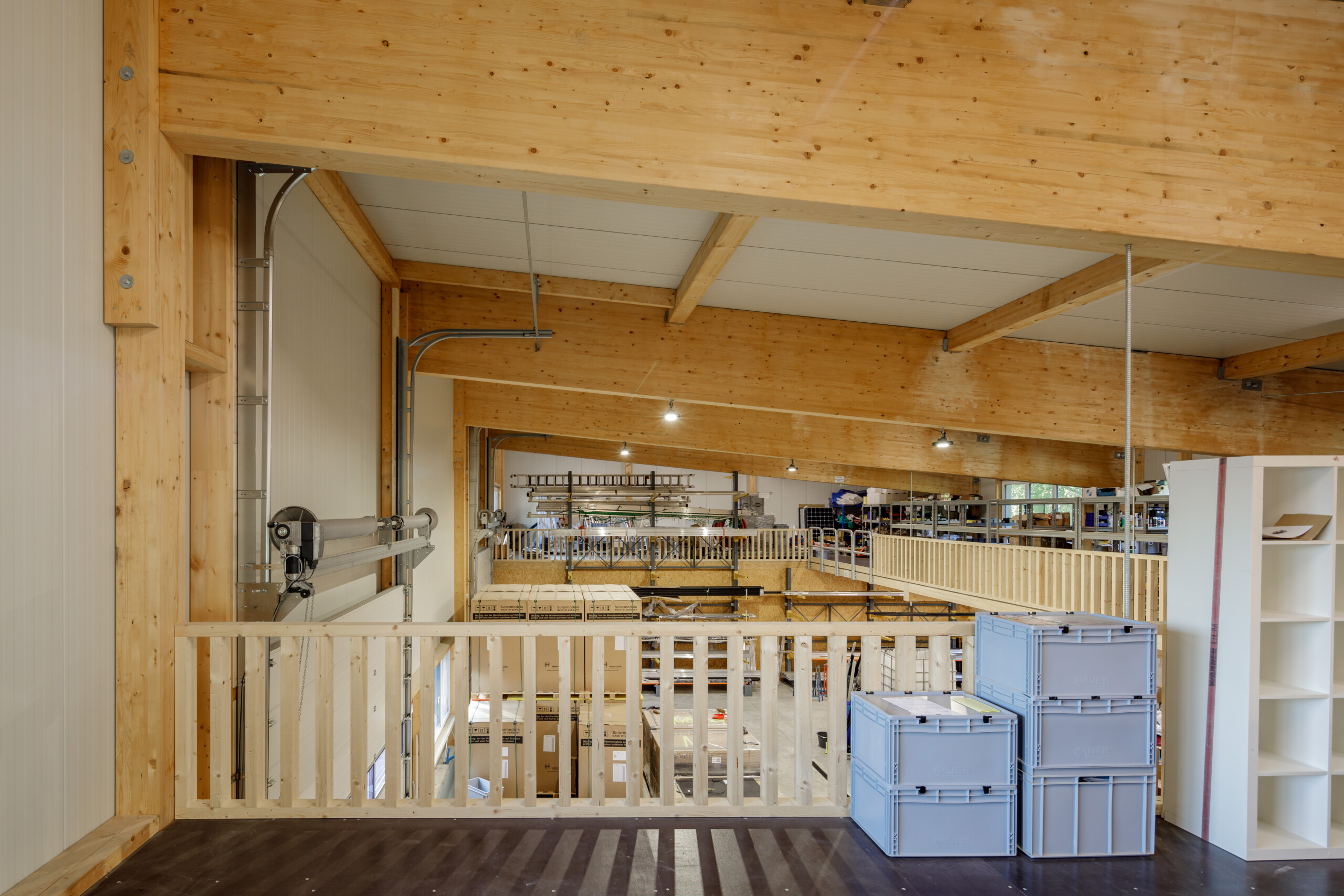 Neben grosszügiger Lagerfläche wurde auch ein Werkbereich für Spezialanfertigungen sowie ein kompakter Büro- und Sozialtrakt in die Halle integriert. Die gesamte Tragstruktur sowie die Gebäudehülle wurden in Holzbauweise realisiert – was nicht nur für ein angenehmes Raumklima sorgt, sondern auch den ökologischen Anspruch des Unternehmens unterstreicht.